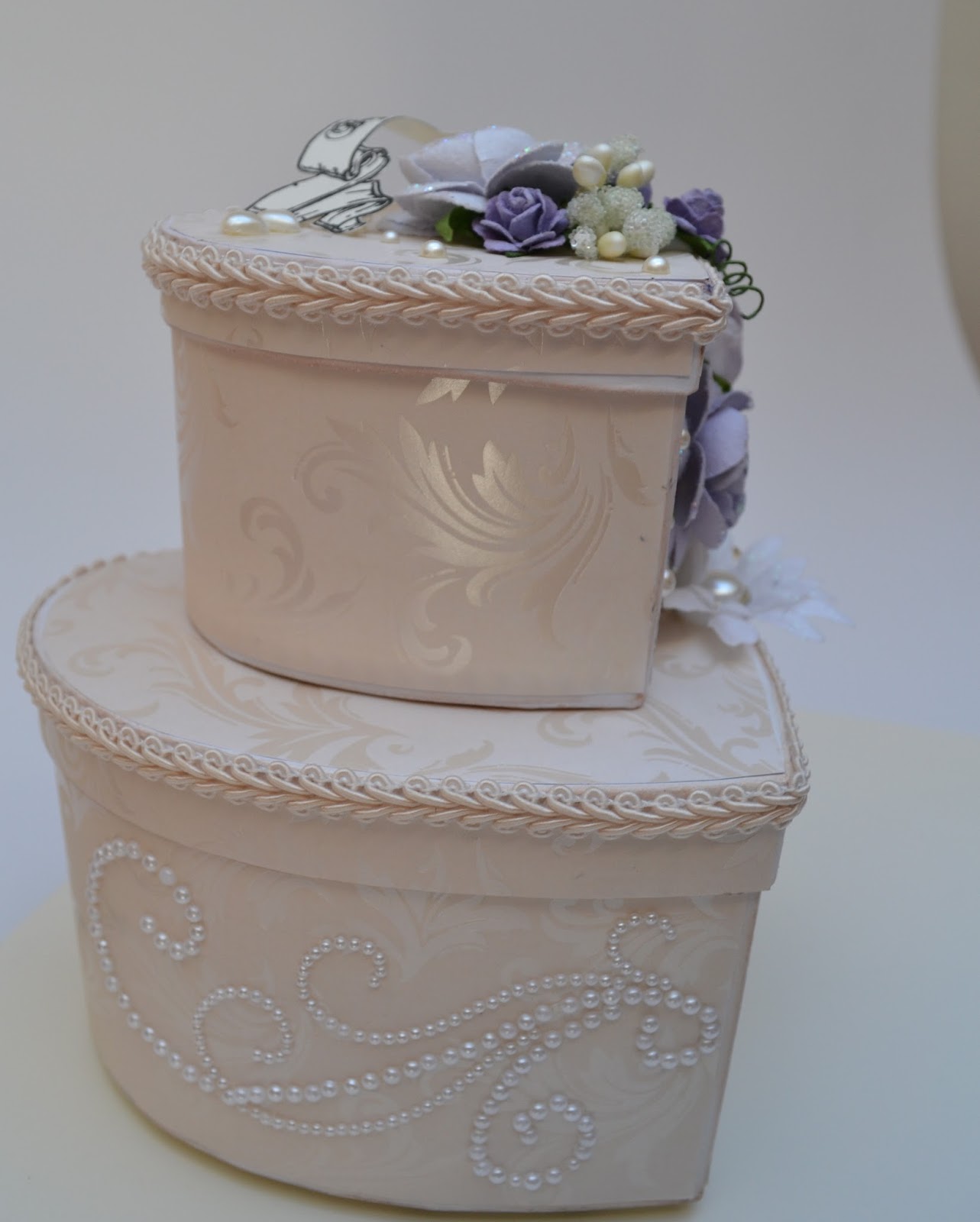 Vel, jeg har valgt å la denne boksen gå i hvitt på hvitt. Jeg synes det er så delikat. Som base har jeg brukt Bazzil hvit, pyntet med noteark og en vakker dies fra Marianne design. Perleranden oppe og nede på boksen er fra Nille. Har brukt et blondebånd med blomster på. Sølvstjernene er fra Kort og Godt. Skøytene er fra en TH dies, pyntet med sølvtråd. En perlesvirl fra Storyteller.